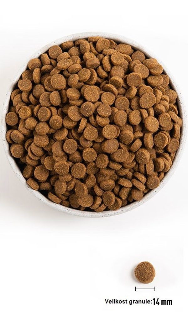 Białko surowe 27%, zawartość tłuszczu 16%, popiół surowy 7,5%, włókno surowe 5%, wilgotność 12%, wapń 1,2%, fosfor 0,9%, kwasy tłuszczowe omega-6 2,6%, kwasy tłuszczowe omega-3 1,1%, DHA 0,4%, EPA 0,3%.