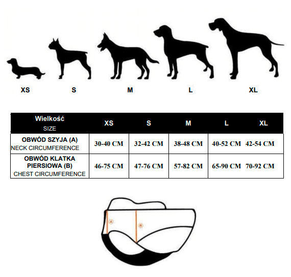 Ostrzegawcza kamizelka odblaskowa i ochronna z kevlarowym ochraniaczem klatki piersiowej i kieszonką na odbiornik DOG GPS (obroża). Z tyłu znajduje się pętla do przypięcia smyczy.