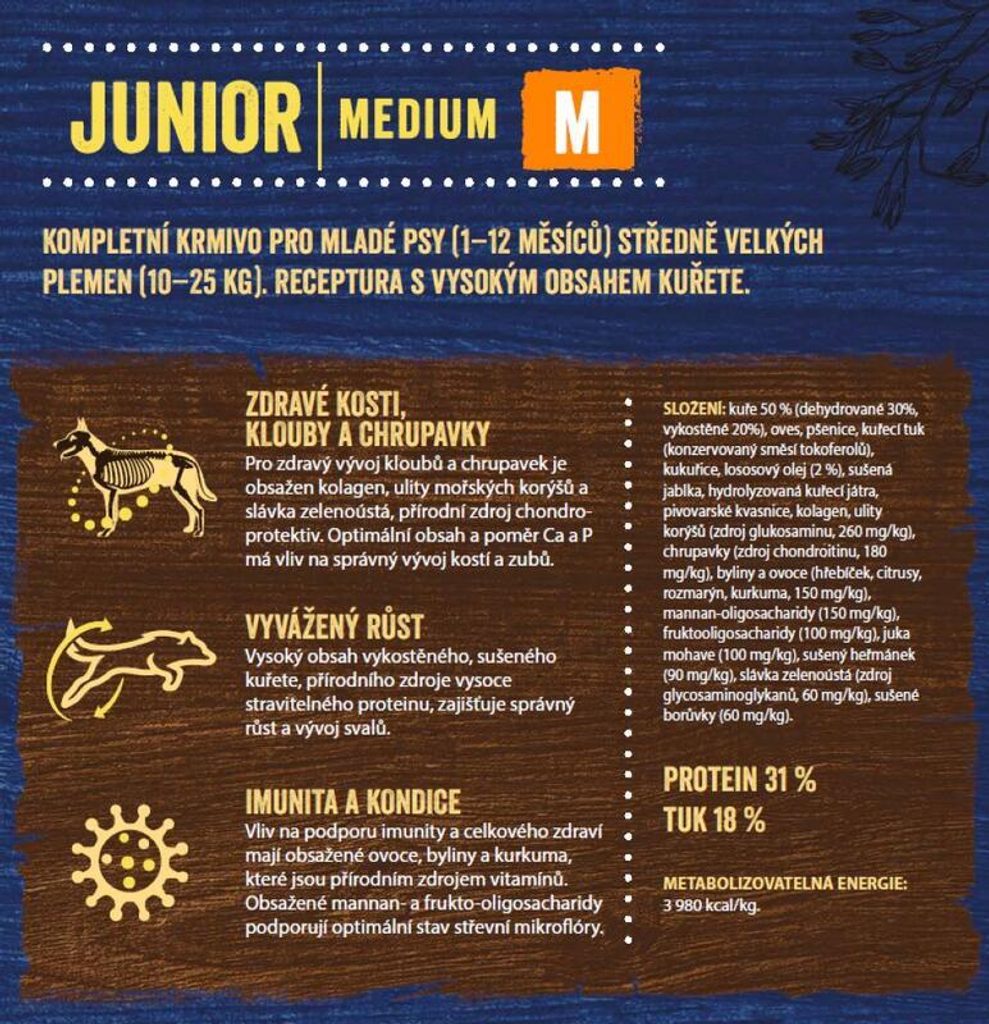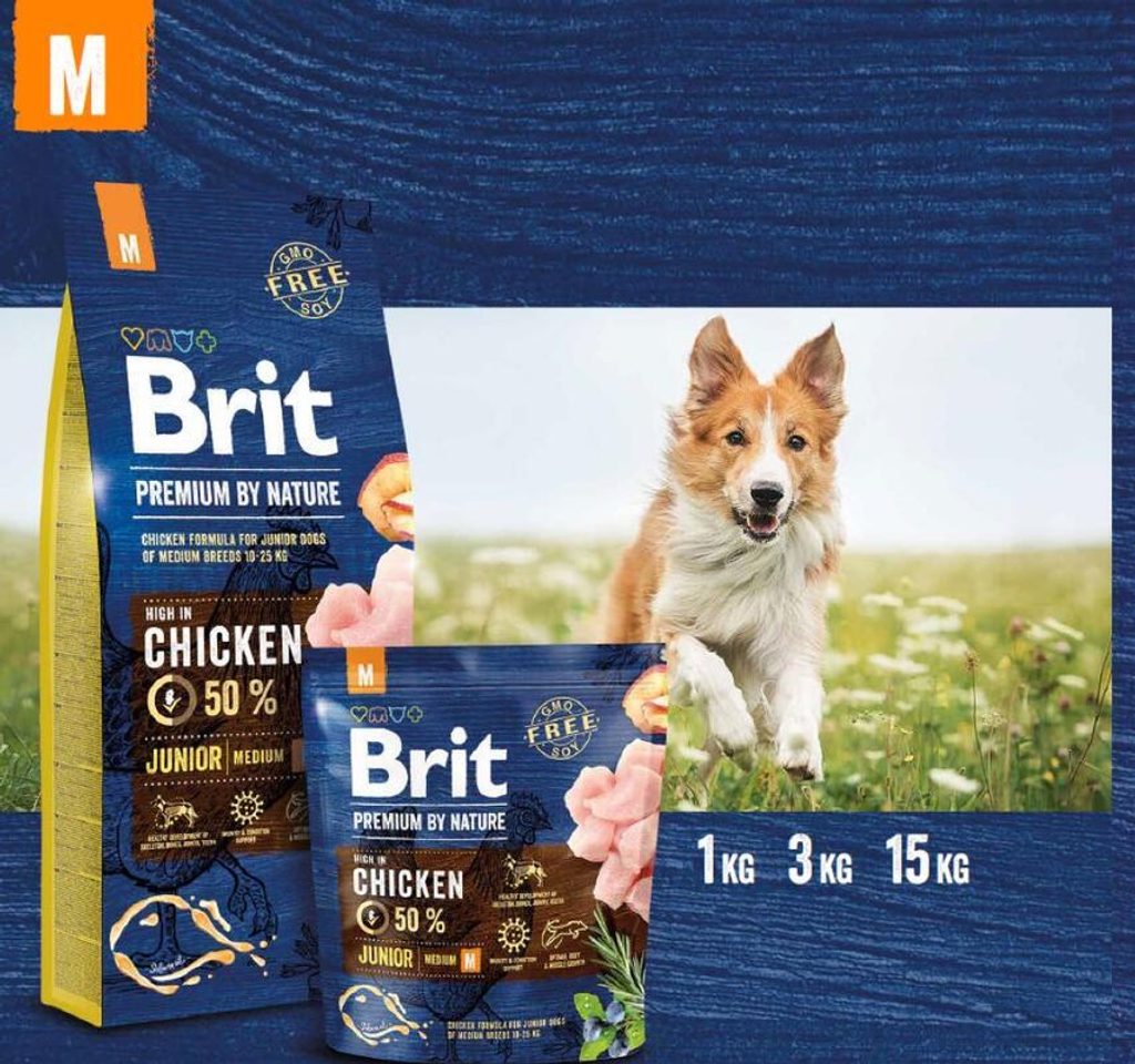 Brit Premium by Nature Junior M to kompletna karma premium marki Brit dla szczeniąt ras średnich w wieku 1–12 miesięcy, które w wieku dorosłym osiągną wagę 10–25 kg. Wyprodukowana jest w 50% ze świeżego i suszonego mięsa z kurczaka, dzięki czemu ma doskonały smak i intensywny aromat. Granulki nie zawierają GMO ani soi i są doskonale przyswajalne.